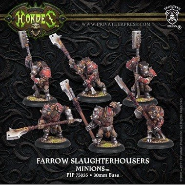 Bloodthirsty, tough as nails, and strong enough to hack the arms off a gorax, slaughterhousers serve as vicious shock troops in farrow warbands. Heedless of danger, slaughterhouser units charge recklessly into battle, cutting a wide swath through the enemy with their massive pole cleavers and shaking off wounds that would kill or incapacitate lesser farrow.