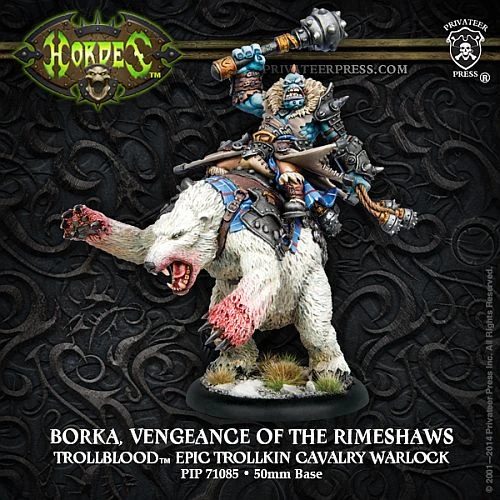 As war continues to consume the lands of the trollkin, Borka, Vengeance of the Rimeshaws rides atop his powerful northern bear Arktos like a savage chieftain of old, bringing swift death to his enemies. The northern wind follows Borka, freezing his enemies in their tracks to stand helpless before the onslaught.